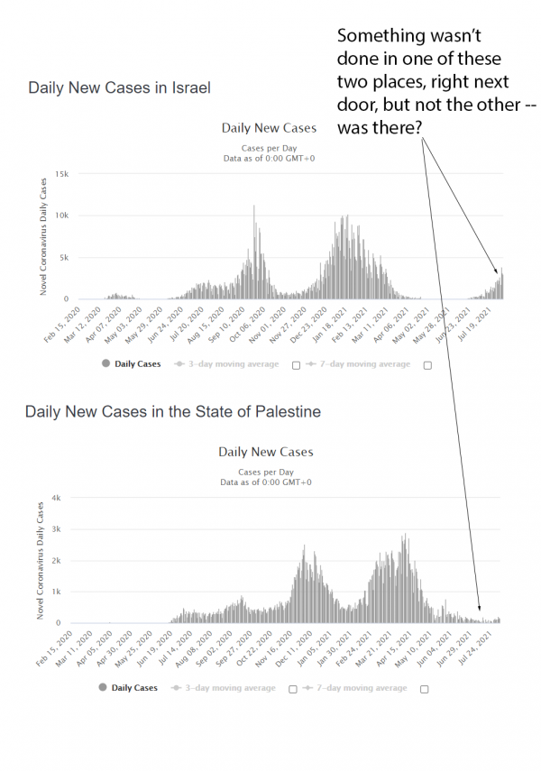 And we have the proof. Israel, the most vaxxed country in the world, is experiencing a surge in cases among the vaxxed, while neighboring Palestine with virtually no one vaxxed is experiencing no surge. And now Israel is locking down again. Are the vaccines causing the Delta surge? You certainly won’t get an honest answer from Fauci & Pfizer. There are hundreds of billions in profits to be made. Just get that booster and all will be well.