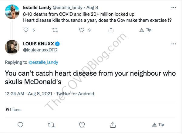 A hint of irony sneaked through one of this final Twitter posts. A woman correctly stated that heart disease kills thousands of people per year, but government does not force anyone to exercise. Mr. Knuxx responded with more mockery.