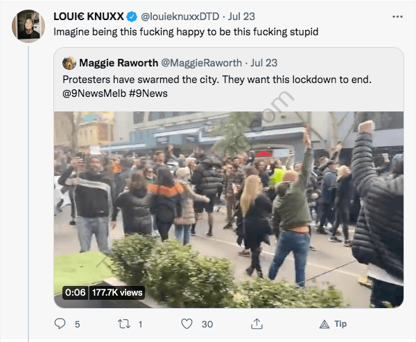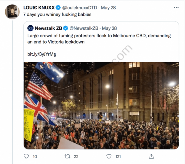 Mr. Knuxx’s vitriolic rhetoric and attitudes towards anti-lockdown protesters in Australia had been ongoing since at least May. He referred to thousands of protesters in Melbourne as “whiney fucking babies.”
