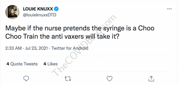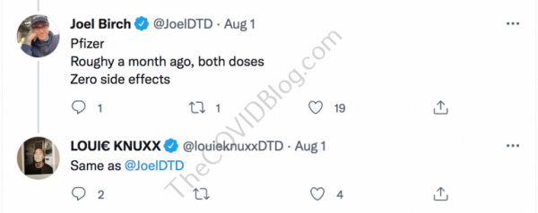 Mr. Todd Williams, aka Louie Knuxx, received his second dose of experimental Pfizer mRNA on July 15, according to his Twitter page. He reported sore arms the following morning, but no other adverse effects. He also said he was “ready to party.”
