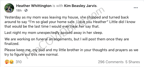 Mrs. Jarvis, as she normally and frequently did, posted several bulletins about missing dogs in West Virginia on August 30. Her last post was at 7:17 p.m. local time. She apparently went to her daughter Heather’s house that night. Mrs. Jarvis told Heather “I love you” and “I’m so glad you’re home safe.” The next day, Heather posted an update. She said her mother “passed away unexpectedly in her sleep” that night, hours after she saw her.