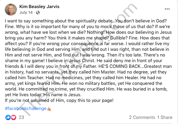 Mrs. Jarvis took many subtle jabs (no pun intended) at the non-vaccinated. She was also a Christian. Yet she wondered why non-Christians mocked her faith.