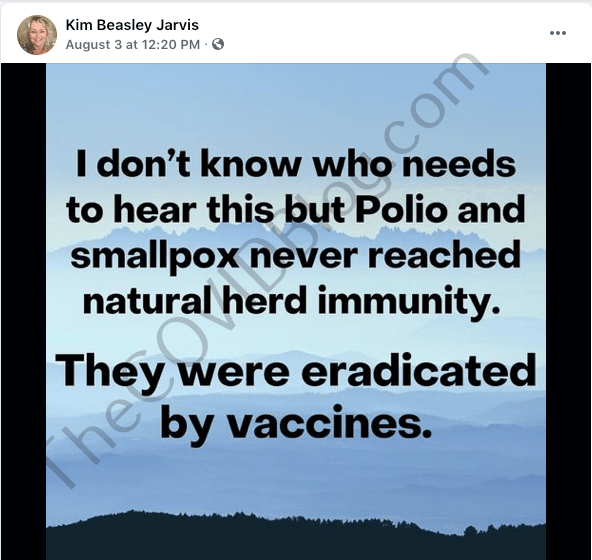 Mrs. Kim Jarvis declared on August 29, “I am vaccinated.” She did not clarify which injections she received, nor did she specify when she received the injections. A search through her Facebook posts from May 1 to August 29 revealed no further information. It frankly doesn’t matter which injection she received as all of them are equally lethal. But it’s the rest of her lengthy post that day that makes this story so bizarre.