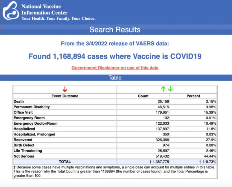 U.S. VAERS data from Dec. 14, 2020, to March 4, 2022, for all age groups combined, show: